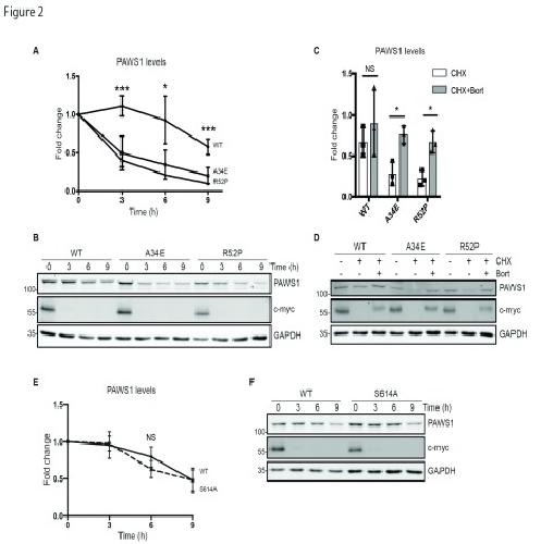 R52P were treated with 100 µg/ml cycloheximide for the indicated times prior to sample collection. PAWS1 band intensities were measured, normalised to GAPDH loading control, and represented relative to the respective 0 h samples (n=3, error bars represent ± SD). Representative blots are shown in (