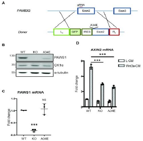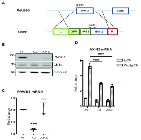 A: Schematic overview of CRISPR/Cas9 knock-in strategy. A GFP coding sequence, internal ribosome entry site (IRES), and mutations to the PAWS1 coding sequence in Exon2 were introduced by homology-directed repair with a plasmid donor. Further details are available in the Materials and methods section. L