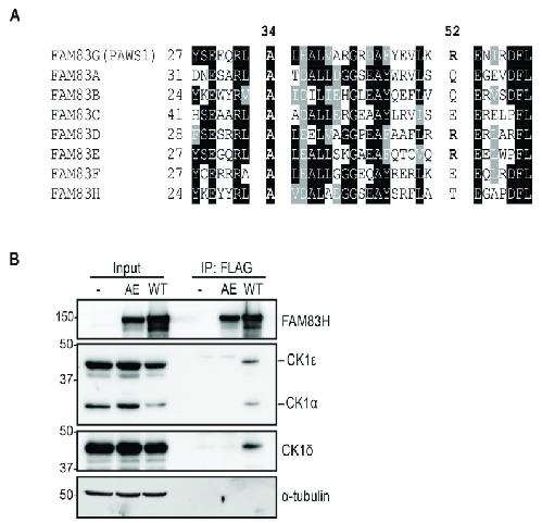 A31E (AE) were transiently expressed in FAM83H-KO U2OS cells. Cells were lysed, FLAG IPs were performed and IPs were analysed by immunoblotting for CK1 isoforms.