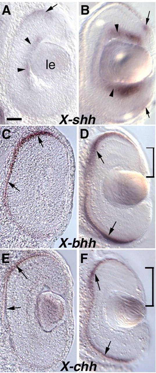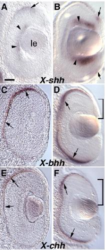 Fig. 2. Expression of X-bhh, X-chh and X-shh on retinal sections. These panels show retinal vibratome sections after whole-mount in situ hybridisation. The probes are indicated for each panel. (A,C,E) Retinas of stages 34-36 embryos. (B,D,F) Retinas of stage 42 embryos. (A) X-shh is expressed in the RPE (arrow) and in the ganglion cell layer (arrowheads). (B) X-shh is strongly expressed in ganglion cells (arrowheads) and a faint staining is visible in a cluster of cells in the outer layer and the RPE (arrow). (C,E) X-bhh and X-chh are expressed in the RPE (arrows). (D,F) X-bhh and X-chh are still strongly expressed in the RPE (arrows), excluding the peripheral pigmented epithelium (bars). le, lens. Dorsal is on the top. Scale bar: 40 μm. |