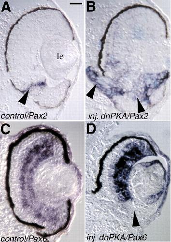 Fig. 5. Overexpression of dnPKA leads to proximodistal defects. Embryos were injected at the two-cell stage with RNA for dnPKA (B,D), then cultured until stage 39. (A,C) Control embryos. In situ hybridisation on cross-sections was then performed using Pax2 (A,B) or Pax6 (C,D) probes (dark blue). Overexpression of dnPKA leads Pax2 expression to expand in the neural retina compared with the control (arrowheads), whereas it inhibits expression of Pax6 in the ventral retina (arrowhead). le, lens. Dorsal is towards the top. Scale bar: 40 μ m. |