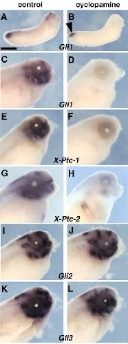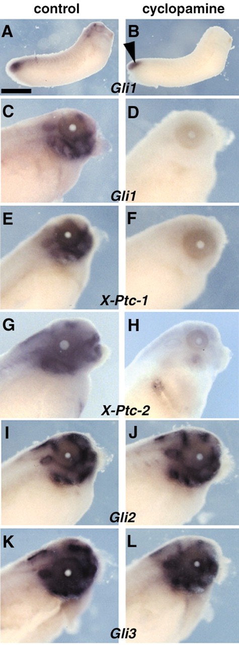 Fig. 6. Cyclopamine treatment blocks Hh signalling in Xenopus. Whole-mount in situ hybridisation on embryos incubated in cyclopamine solution from stage 20 onwards (B,D,F,H,J,L) or control embryos (A,C,E,G,I,K). The probes are indicated for each panel. (C-L) Stage 41 embryos; (A,B) stage 30 embryos. Cyclopamine treatment leads to a strong reduction of Gli1, X-Ptc-1 and X-Ptc-2 expression. Some Gli1 expression remains only in the tailbud (arrowhead in B). Expression of both Gli2 and Gli3 is not affected. Anterior is towards the left. Scale bar: 1.35 mm in A,B; 300 μm in C-L. |