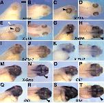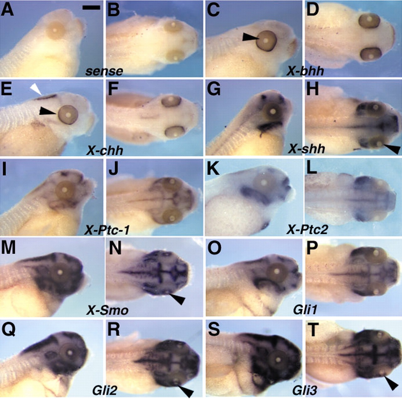 Fig. 1. Expression of Hh pathway components in whole-mount Xenopus embryos. Whole-mount in situ hybridisation on stage 41 embryos using probes as indicated. For each probe a lateral view and a dorsal view are shown. A Gli3 sense probe has been used in A,B. Expression of X-bhh and X-chh in the retina is restricted to the RPE (black arrowheads in C,E). X-chh is also expressed in the hindbrain (white arrowhead in E). In addition to a strong expression in the brain, some expression in the retina can be detected for X-shh, X-Smo, Gli2 and Gli3 (arrowheads in H,N,R,T). Although a strong expression in the brain can be detected, expression of X-Ptc-1, X-Ptc-2 and Gli1 in the retina at this stage is very weak (I-L,O-P). Anterior is towards the right. Scale bar: 300 μm. |