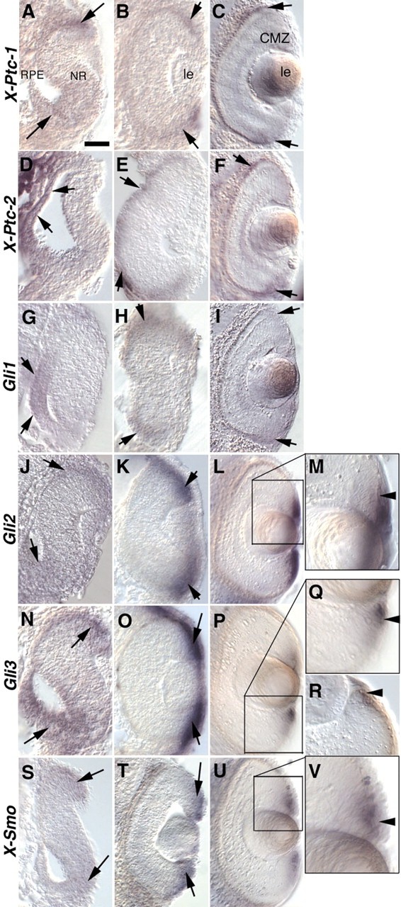 Fig. 3. Expression of X-Ptc-1, X-Ptc-2, X-Smo, Gli1, Gli2 and Gli3 on retinal sections. These panels show retina vibratome sections after whole-mount in situ hybridisation. The probes are indicated on the left of each series of panels. (A,D,G,J,N,S) Stages 28-30 embryos. (B,E,H,K,O,T) Stage 34-36 embryos. (C,F,I,L,P,U) Stage 40-41 embryos. (M,V) Dorsal CMZ. (Q,R) Ventral CMZ. (A) X-Ptc-1 expression is detected in the periphery of the optic vesicle (arrows). (B,C) X-Ptc-1 expression is still detected in the periphery of the retina albeit at a low level, including the RPE (arrows). (D,G) X-Ptc-2 and Gli1 are expressed in the presumptive RPE (arrows). (E,H) X-Ptc-2 and Gli1 expression is still clearly detected in the RPE (arrows). (F,I) A faint X-Ptc-2 and Gli1 expression is detected in some cells of the RPE (arrows). (J,N,S) Gli2, Gli3 and X-Smo expression is detected in the periphery of the optic vesicle (arrows). (K,O,T) Gli2, Gli3 and X-Smo expression is restricted to the periphery of the retina (arrows). (L,P,U) Gli2, Gli3 and X-Smo expression is restricted to the periphery of the CMZ where stem cells are present. Magnifications of these regions (M,Q,V) show that these genes are also expressed in the peripheral pigmented epithelium (arrowheads point to stained cells with a longitudinal shape that shows its belonging to the RPE). (R) When the RPE has been poorly bleached, we can detect Gli3-positive pigmented cells (arrowhead). Dorsal is towards the top. le, lens; NR, presumptive neural retina; RPE, presumptive RPE; CMZ, ciliary marginal zone. Scale bar: 60 μm for A-L,N-P,S-U; 20 μm for M,Q,R,V. |