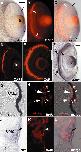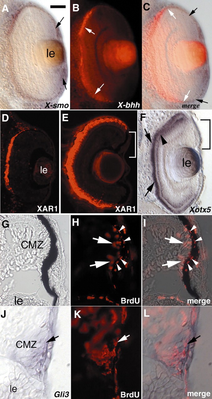 Fig. 4. The retinal pigmented epithelium includes several cell populations. Double in situ hybridisation was performed with X-Smo in blue (arrows in A) and X-bhh in red (weak in bright field, A; strong under fluorescence, arrows in B). (C) Overlapping staining shows that some cells are negative for expression of both genes in between the two expression domains (white and black arrows give the approximate limits of X-bhh and X-Smo expression domains, respectively). (D,E) Immunostaining with the antibody XAR1 on retinal cross-section of stage 36 and 42, respectively. Staining is detected in the RPE except in the peripheral pigmented epithelium (bars in E). (F) In situ hybridisation on stages 38 embryos with a Xotx5 probe. Xotx5 is expressed in the photoreceptor layer (arrowhead) and strongly in the RPE (arrows), excluding the peripheral pigmented epithelium (bars). (G-I) Staining for BrdU uptake in retina cross-sections of stage 42 embryos. (G) The retina in bright field; (H) BrdU immunostaining. (I) An overlap of G and H shows that some BrdU-positive cells are present in the peripheral pigmented epithelium (arrowheads). Arrows indicate some BrdU-positive cells in the CMZ. (J-L) Double staining for BrdU uptake and Gli3 expression. Gli3 staining is shown in J, BrdU immunostaining in K. Double staining in L shows that some BrdU-positive cells in the peripheral pigmented epithelium are also Gli3 positive (arrow). le, lens; CMZ, ciliary marginal zone. Scale bar: 45 μm in A-F; 15 μ m in G-L. |