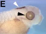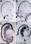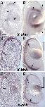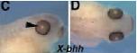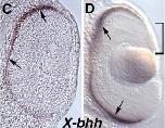 ihh9 (indian hedgehog) gene expression in Xenopus laevis eye.C Retina of stages 34-36 embryo. D Retina of stage 42 embryo. Expression is in the RPE. |