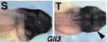 gli3 (GLI family zinc finger 3) gene expression in Xenopus laevis embryo via in situ hybridization, NF stage 41, lateral view, head region only, anterior right. |