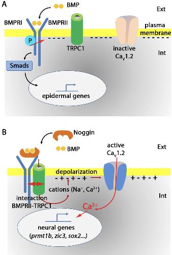 Figure 8. Hypothetical model to depict the role of Trpc1 channels in linking the inhibition of BMP pathway by noggin, and the activation of Cav1.2 channels in ectodermal cells. During gastrulation, the cells of the embryonic ectoderm have the choice between two fates; they can give rise to either epidermal or neural progenitors. In the plasma membrane, the molecular components involved in this choice are BMP receptors type I (BmprI) and type II (BmprII), Trpc1 and voltage-dependent Ca2+ channels (Cav1.2). The membrane potential in the ectoderm is ~â60 mV; i.e., the interior is negatively charged62. (A) Induction of the epidermis occurs through a signalling cascade, which involves the binding of Bmp4 to its receptor, and then the transphosphorylation of BmprII by BmprI. This is followed by the activation of Smads, which translocate into the nucleus to form active transcriptional complexes to control the expression of epidermal genes. In this scenario, there is no interaction between Trpc1 and BmprII, and Cav1.2 remains inactive. (B) During neural induction, noggin binds to BMP4, and thus prevents the activation of the BMP pathway. As a consequence, it induces a physical interaction between BmprII and Trpc1 channels. This interaction leads to the activation of Trpc1, which either alone or associated with other Trp channels (e.g., Trpv4), triggers an influx of cations (Ca2+ and Na+). This influx of cations depolarizes the membrane (i.e., there is more positive charge inside) up to a threshold sufficient to open the voltage-gated Ca2+ channel, Cav1.2. As we have previously shown27,29, the resulting influx of Ca2+ is then sufficient to activate the expression. |