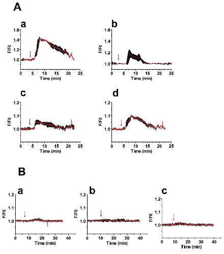 Figure S3: Trpc1 knock down abolishes the increase in intracellular Ca2+ generated following the activation of CaV1.2 channels in animal cap explants. (A-B) Relative changes in fluorescence (F/F0) reveal changes in intracellular Ca2+ generated in a single animal cap loaded with the Ca2+ -indicator Fluo4 after being isolated from an embryo injected with either (A) control-MO or (B) TRPC1-MO1. In (A) panels (a-d), and in (B) panels (a-c), the graphs show examples of 4 and 3 independent experiments, respectively. Values are plotted as the F/F0 mean (red traces) + SEM (black bars) from 4 (A) or 10 (B) randomly selected fields within a single animal cap. Noggin (3 µg/mL) was added (blue arrows) within the first 10 min after the start of data acquisition. |