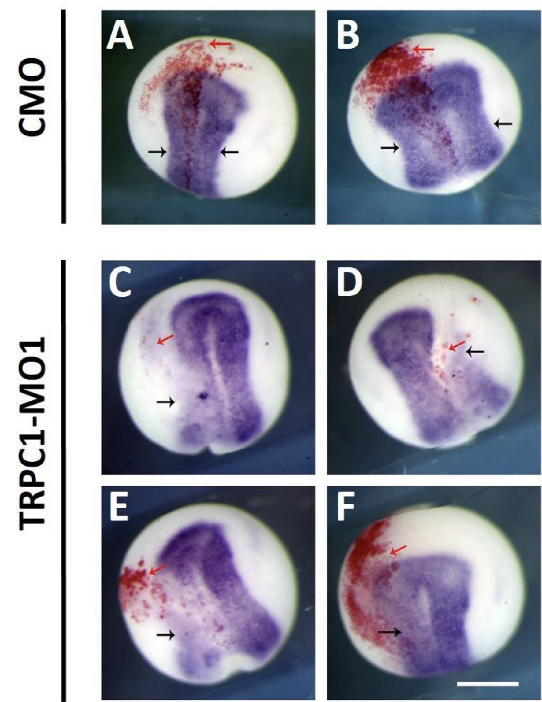 Figure S4: trpc1 knock-down impairs the expression of the early neural gene, sox2. Embryos were co-injected at the 8-cell stage into a single dorsal animal blastomere with nuclear β-galactosidase mRNA (150 pg) and either (A,B) the standard control-MO (CMO; 17 ng) or (C-F) TRPC1-MO1 (17 ng). Embryos were then fixed at stage 14 for subsequent whole-mount in situ hybridization for sox2; see black arrows. The side of the embryo injected with MO was confirmed by reaction of β-galactosidase with Red-Gal, as shown by the red labelling on each embryo; see red arrows. (A-B) Images from 2 different embryos injected with CMO showing similar levels of sox2 expression on the left and right side of the embryos. (C-F) Images from 4 different embryos injected with TRPC1-MO1 showing that the expression of sox2 was reduced (see black arrows) on the injected side. Scale bar 500 µm |