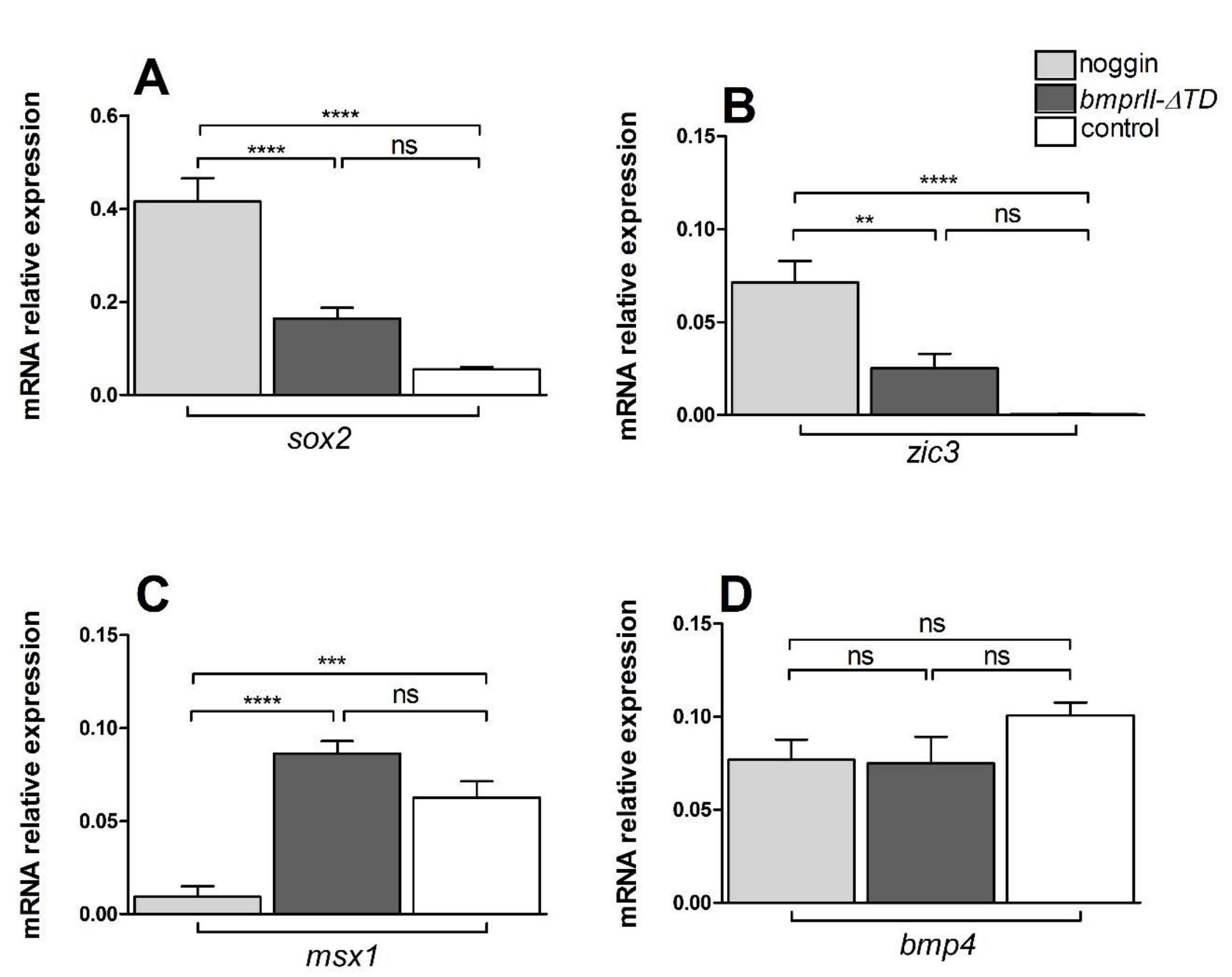 Figure S6. The truncated form of BmprRII (BmprII-deltaTD) has no neural inducing activity. RT-qPCR analysis of two neural genes, zic3 (A) and sox2 (B), and two genes controlling epidermal fate, msx1 (C) and bmp4 (D), in noggin-treated stage 9 animal caps (grey bars), in animal caps over-expressing bmprII-deltaTD (black bars) and in control animal caps (white bars). Expression was normalized to the housing keeping gene odc (ornithine decarboxylase). When comparing the level of expression of these 4 genes in animal caps over-expressing bmprII-deltaTD, with the level of expression in noggin treated and control animal caps, these data indicate that bmprII-deltaTD has no neural inducing activity, (one way ANOVA with Bonferroniâs test, **P<0.001, ****P<0.0001). The data represent the mean ± SEM of 8 independent experiments, with 20 animal caps in each experiment. |