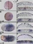 Fig. S1 Xpod mRNA expression during early SSC development. Xpod whole mount in situ hybridization at neurula (A) and early tadpole stages (BâD). Histological sections (AââDâ) revealed that SSCs expressed Xpod prior to intercalation into the superficial layer (arrowheads in close ups Aâ, Bâ²â or dashed line in Câ²â). At Stage 24, most SSCs were intercalated (arrowhead in Dâ).