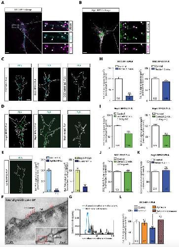 Figure 3. DCC and Nrp1 are in close proximity to ribosomes in axonal growth cones in a cue-dependent manner.(A) Expansion imaging shows partial co-localization of DCC and (B) Nrp1 with ribosomal proteins (Scale bars, 5 μm). (C) Representative proximity ligation assay signal in axonal growth cones between DCC and RPL5/uL18, RPS4X/eS4 or IgG control (Scale bars, 5 μm). (D) Representative proximity ligation assay signal in axonal growth cones between Nrp1 and RPS3A/eS1, RPS23/uS12 or IgG control (Scale bars, 5 μm). (E) Representative PLA signal in axonal growth cones between EphB2 and RPL5/uL18 (left) and quantification of PLA signal in axonal growth cones compared to DCC-RPL5/uL18 or Nrp1-RPS23/uS12 (right) (Mann-Whitney test; three biological replicates; bars indicate mean, error bars indicate SEM, ***p<0.0001; Scale bars, 5 μm). (F) EM image of an unstimulated axonal growth cone showing ribosomes aligned in a row (red arrows) under plasma membrane (PM). Inset shows the growth cone at lower magnification; the red box indicates the area shown in higher magnification. The section glances through the extreme surface of growth cone, where it attaches to the culture dish, giving rise to areas that lack subcellular structure. (G) Distribution frequency of the inter-ribosome distance in nm of ribosomes in axonal growth cones (n = 20) or in RGC soma (n = 5). All distances larger than 100 nm were pooled together. (H, I, J, K) Quantification of PLA signal in cue-stimulated axonal growth cones relative to control (unpaired two-tailed t-test; bars indicate mean, error bars indicate SEM; ***p<0.0001; *p=0.0423; for n.s. in J p=0.3522; for n.s. in K, p=0.885). (L) Relative PLA quantification of DCC and RPL5/uL18 compared to control after Dynasore pre-treatment (50 μM for 20 min), Netrin-1, or Netrin-1 + Dynasore (one-way ANOVA with Bonferroniâs multiple comparisons test; bars indicate mean, error bars indicate SEM; p=0.001027 for Control vs. Netrin-1, p=0.000402 for Netrin-1 vs Netrin-1 + Dynasore, p=0.590377 for Control vs. Dynasore, p=0.384848 for Control vs Netrin + Dynasore). For all PLA experiments, numbers in bars indicate total number of growth cones quantified from at least three independent experiments.Figure 3âsource data 1. Spreadsheet containing PLA counts and relative comparisons from each axonal growth cone in Figure 3E, all inter-ribosome distances and distribution shown in Figure 3G, and all normalized PLA count values for each axonal growth cone in Figure 3HâL.Figure 3âfigure supplement 1. DCC and Nrp1 are in close proximity to ribosomes in axonal growth cones in a cue-dependent manner.(A) Pearsonâs Correlation coefficients of DCC-RPL5/uL18 and Nrp1-RPS3A/eS1 from expanded axonal growth cones (data obtained from four biological replicates, bars indicate mean, error bars indicate SEM). (B) PLA images showing DCC and RPL10A/uL1 are in close proximity in axonal growth cones, whereas DCC and IgG control generates little to no PLA signal. Scale bars, 5 μm. (CâE) EM images of an unstimulated axonal growth cone (C), a growth cone lamellipodium (D) and a retinal ganglion cell body (E). Ribosomes can be seen aligned in rows (red arrows) or isolated (white arrow) under the plasma membrane and as polysomes (blue arrows) in the cell body. (F) PLA signal between DCC and hnRNPA2B1 does not decrease after a 2 min Netrin-1 stimulation in axonal growth cones (Mann-Whitney test; bars indicate mean, error bars indicate SEM; p=0.2886; representative PLA images are shown). (G) Sema3A stimulation at protein-synthesis independent concentration does not decrease puromycin levels in axonal growth cones (Mann-Whitney test; bars indicate mean, error bars indicate SEM; p=0.2487; representative images are shown) or (H) PLA signal between Nrp1 and RPS3A/eS1 (Mann-Whitney test; bars indicate mean, error bars indicate SEM; p=0.2555). For all Expansion microscopy, PLA and QIF experiments, numbers in bars indicate amount of growth cones quantified collected from at least three independent experiments.Figure 3âfigure supplement 1âsource data 1. Spreadsheet containing all Pearsonâs correlation values for each expanded growth cone in Figure 3âfigure supplement 1A, all normalized PLA count values for each axonal growth cone in Figure 3âfigure supplement 1F and H, and all normalized puromycin intensity values for each axonal growth cone in Figure 3âfigure supplement 1G. |