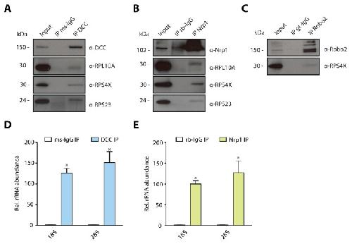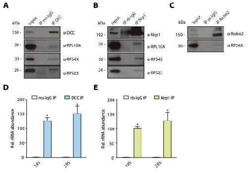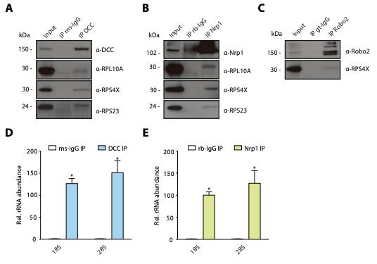 Figure 1 â Figure Supplement 1. Multiple guidance cue receptors interact with ribosome in SH-SY5Y cells. (A-C) Western blot validation of RP co-immunoprecipitation with DCC, Nrp1 and Robo2 in SH-SY5Y cells. Western blots were repeated 2 to 4 times, Rps4X Western blots are from 1 experiment, representative examples are shown. (D-E) Relative 18S and 28S ribosomal RNA abundance after control (IgG) pulldowns or receptor pulldowns shows enrichment of rRNA in DCC and Nrp1 IPs in SH-SY5Y cells (unpaired two tailed t-test; three biological replicates; Bars indicate mean, error bars indicate standard deviation. *p<0.05). |