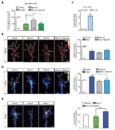 Figure 4 â Figure Supplement 1. EphrinA1 co-stimulation blocks Netrin-1 induced receptor-ribosome dissociation and selective translation of rps14. (A) Relative PLA quantification of Nrp1 and RPS23/uS12 compared to control after Sema3A, EphrinA1, or co stimulation with Sema3A and EphrinA1 (one-way ANOVA with Bonferroniâs multiple comparisons test; bars indicate mean, error bars indicate SEM; *p=0.032078; **p<0.018577; ***p<0.001). (B) pERK1/2 QIF relative to control after Netrin-1, EphrinA1 or Netrin-1 and EphrinA1 co-stimulation (one-way ANOVA with Bonferroniâs multiple comparisons test; bars indicate mean, error bars indicate SEM; ***p<0.0001). (C) Relative mRNA quantification after DCC IP of rps14 mRNA (unpaired t-test with Welchâs corrections on dCT values; three biological replicates; bars indicate mean, error bars indicate SEM; ***p = 0.0003). (D) Rps14 QIF relative to control after Netrin-1, EphrinA1 or Netrin-1 and EphrinA1 co-stimulation (one way ANOVA with Bonferroniâs multiple comparisons test; bars indicate mean, error bars indicate SEM; ***p<0.0001; *p=0.026544). (E) Rps14 QIF relative to control after Netrin-1 or Sema3A stimulation (one-way ANOVA with Bonferroniâs multiple comparisons test; bars indicate mean, error bars indicate SEM; ***p<0.0001; *p<0.05). Scale bars, 5 ïm. For all QIF experiments the numbers in bars indicate amount of growth cones quantified collected from three independent experiments. |