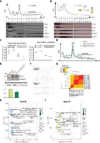 Figure 2—figure supplement 1. Polysome fractionation analysis, RNase sensitivity of Nrp1-Staufen1 interaction and additional RNA-seq analyses.(A) Control and (B) EDTA treated polysome fractions and Western blot showing the distribution of DCC and Nrp1 across fractions. (C) Relative quantification of DCC and Nrp1 protein levels in ribosome-free and ribosomal fractions for control and EDTA-treated samples (DCC control n = 2, DCC EDTA n = 2, Nrp1 control n = 2, Nrp1 EDTA n = 1; Bars indicate mean, errors bars indicate standard deviation). (D) UV absorbance profiles after sucrose density gradient fractionation for control and RNAseA/T1 treated lysates. (E) Western blot analysis and quantification of Staufen1 after Nrp1 pulldowns. (paired t-test; three biological replicates; bars indicate mean, error bars indicate standard deviation; p=0.0136). (F) Bioanalyzer gel analysis of RNA. (G) Distance matrix showing a high correlation between replicates and a distinct signature between samples. (H) Gene ontology enrichment plot of mRNAs after DCC or (I) Nrp1 pulldowns. |