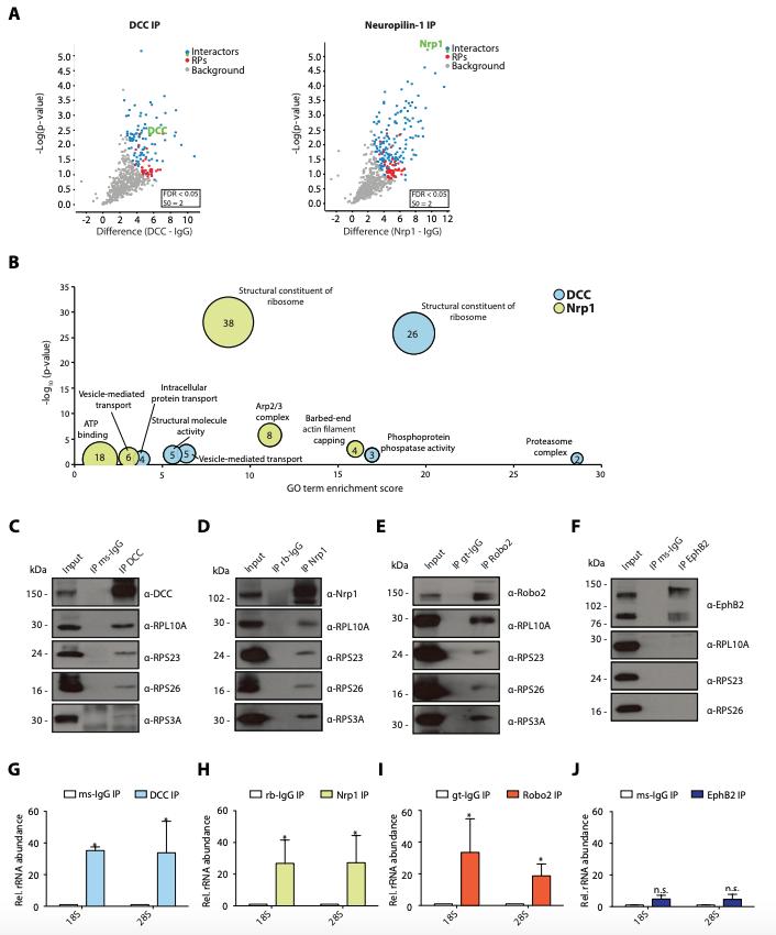 Figure 1. Multiple guidance cue receptors interact with ribosomes (A) Volcano plots showing statistically enriched proteins in DCC-IP and Nrp1-IP samples identified by permutation-based FDR-corrected t-test based on three biological replicates. The LFQ intensity of the DCC or Nrp1 pulldowns over IgG pulldowns are plotted against the -log10 p-value. FDR <0.05; S0 = 2. (B) Gene enrichment analysis of statistically enriched proteins in the DCC and Nrp1 pulldown samples. The values in each circle denotes protein count. (C-F) Western blot validation of RP co-immunoprecipitation with DCC, Nrp1 and Robo2 but not with EphB2. Each Western blot was repeated 2 to 4 times, representative images are shown. (G-J) Relative 18S and 28S ribosomal RNA abundance after control (IgG) pulldown or receptors pulldowns shows enrichment of rRNA in DCC, Nrp1, and Robo2 but not EphB2 pulldowns (unpaired two-tailed t-test; three biological replicates). Bars indicate means, error bars indicate standard deviation; * p<0.05. |