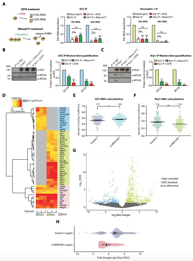 Figure 2. Receptor-ribosome coupling is mRNA dependent and DCC and Nrp1 bind to specific RBPs and mRNAs (A) Relative 18S and 28S ribosomal RNA abundance after control (IgG) pulldown or receptors pulldowns with or without EDTA or RNase A/T1 treatments (two-way ANOVA with Bonferroniâs multiple comparisons test; three biological replicates; Bars indicate mean, error bars indicate standard deviation; ***p<0.0001). (B) Western blot analysis and quantification of ribosomal proteins after DCC and (C) Nrp1 pulldowns. (two-way ANOVA with Bonferroniâs multiple comparisons test; three biological replicates; Bars indicate mean, error bars indicate standard deviation; **p<0.01; ***p<0.0001). (D) Heat-map overview of detected RBPs after DCC and Nrp1 pulldown. LFQ intensities are plotted for each IP-MS replicate. (E) Manderâs overlap coefficients analysed using dual immunohistochemistry of DCC and Staufen1 or hnRNPA2B1 in axonal growth cones (unpaired two-tailed t-test; three biological replicates; individual data points are shown, error bars indicate SEM; p = 0.03913). (F) Manderâs overlap coefficients analysed using dual immunohistochemistry Nrp1 and Staufen1 or hnRNPA2B1 in axonal growth cones (unpaired two-tailed t-test; three biological replicates; individual data points are shown, error bars indicate SEM; p = 0.00161). (G) Volcano plot showing differential expression analysis for DCC and Nrp1 pulldowns. (H) Enrichment analysis plot of known RBP targets of Staufen1 and hnRNPA2B1 detected in RNA- sequencing data after DCC and Nrp1 pulldown (individual data points are shown, error bars indicate standard deviation, Mann-Whitney test, Wilcoxon rank sum test DCC versus Nrp1; p = 0.001511). |