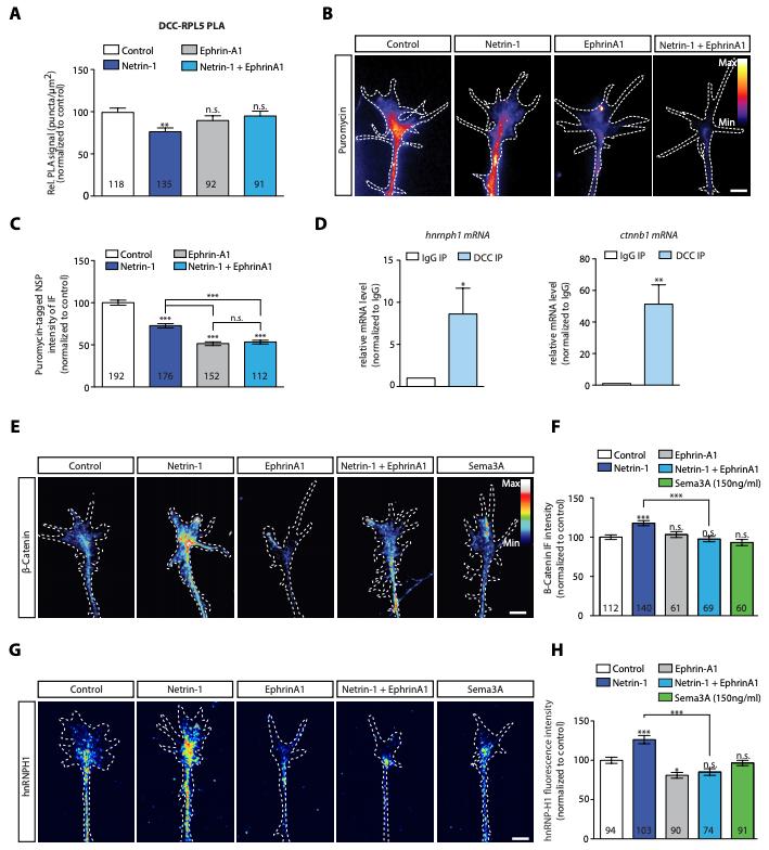 Figure 4. EphrinA1 co-stimulation blocks Netrin-1 induced receptor-ribosome dissociation and selective translation. (A) Relative PLA quantification of DCC and RPL5/uL18 compared to control after Netrin-1, EphrinA1, or co-stimulation (one-way ANOVA with Bonferroniâs multiple comparisons test; bars indicate mean, error bars indicate SEM; **p < 0.01). (B, C) Puromycin QIF relative to control after Netrin-1, EphrinA1 or co-stimulation (one-way ANOVA with Bonferroniâs multiple comparisons test; bars indicate mean, error bars indicate SEM; ***p<0.0001). (D) Relative mRNA quantification after DCC IP of hnrnph1 and ctnnb1 mRNA (unpaired t-test with Welchâs corrections on dCT values; three biological replicates; bars indicate mean, error bars indicate SEM; *p=0.02 for hnrnph1; **p=0.0018 for ctnnb1). (E, F) B-Catenin QIF relative to control after Netrin-1, EphrinA1, Sema3A or Netrin-1 and EphrinA1 co-stimulation (one-way ANOVA with Bonferroniâs multiple comparisons test; bars indicate mean, error bars indicate SEM; ***p<0.0001). (G, H) hnRNPH1 QIF relative to control after Netrin-1, EphrinA1, Sema3A or Netrin-1 and EphrinA1 co-stimulation (one-way ANOVA with Bonferroniâs multiple comparisons test; bars indicate mean, error bars indicate SEM; ***p<0.0001; *p=0.0164). Scale bars, 5 ïm. For all QIF experiments, numbers in bars indicate amount of growth cones quantified collected from at least three independent experiments. |
