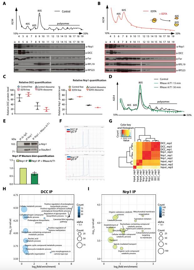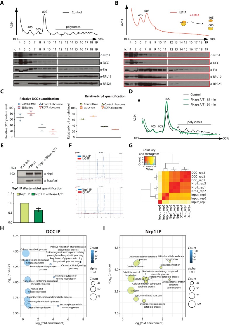 Figure 2 â Figure Supplement 1. Polysome fractionation analysis, RNase sensitivity of Nrp1-Staufen1 interaction and additional RNA-seq analyses. (A) Control and (B) EDTA treated polysome fractions and Western blot showing the distribution of DCC and Nrp1 across fractions. (C) Relative quantification of DCC and Nrp1 protein levels in ribosome-free and ribosomal fractions for control and EDTA-treated samples (DCC control n = 2, DCC EDTA n = 2, Nrp1 control n = 2, Nrp1 EDTA n = 1; Bars indicate mean, errors bars indicate standard deviation). (D) UV absorbance profiles after sucrose density gradient fractionation for control and RNAseA/T1 treated lysates. (E) Western blot analysis and quantification of Staufen1 after Nrp1 pulldowns. (paired t-test; three biological replicates; bars indicate mean, error bars indicate standard deviation; p = 0.0136). (F) Bioanalyzer gel analysis of RNA. (G) Distance matrix showing a high correlation between replicates and a distinct signature between samples. (H) Gene ontology enrichment plot of mRNAs after DCC or (I) Nrp1 pulldowns. |
