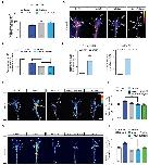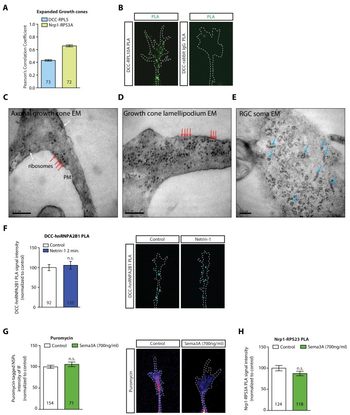 Figure 3 â Figure Supplement 1. DCC and Nrp1 are in close proximity to ribosomes in axonal growth cones in a cue-dependent manner. (A) Pearsonâs Correlation coefficients of DCC-RPL5/uL18 and Nrp1-RPS3A/eS1 from expanded axonal growth cones (data obtained from four biological replicates, bars indicate mean, error bars indicate SEM). (B) PLA images showing DCC and RPL10A/uL1 are in close proximity in axonal growth cones, whereas DCC and IgG control generates little to no PLA signal. Scale bars, 5 ïm. (C-E) EM images of an unstimulated axonal growth cone (C), a growth cone lamellipodium (D) and a retinal ganglion cell body (E). Ribosomes can be seen aligned in rows (red arrows) or isolated (white arrow) under the plasma membrane and as polysomes (blue arrows) in the cell body. (F) PLA signal between DCC and hnRNPA2B1 does not decrease after a 2 min Netrin-1 stimulation in axonal growth cones (Mann-Whitney test; bars indicate mean, error bars indicate SEM; p = 0.2886; representative PLA images are shown). (G) Sema3A stimulation at protein-synthesis independent concentration does not decrease puromycin levels in axonal growth cones (Mann-Whitney test; bars indicate mean, error bars indicate SEM; p = 0.2487; representative images are shown) or (H) PLA signal between Nrp1 and RPS3A/eS1 (Mann-Whitney test; bars indicate mean, error bars indicate SEM; p = 0.2555). For all Expansion microscopy, PLA and QIF experiments, numbers in bars indicate amount of growth cones quantified collected from at least three independent experiments. |