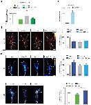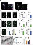 Figure 3—figure supplement 1. DCC and Nrp1 are in close proximity to ribosomes in axonal growth cones in a cue-dependent manner.(A) Pearson’s Correlation coefficients of DCC-RPL5/uL18 and Nrp1-RPS3A/eS1 from expanded axonal growth cones (data obtained from four biological replicates, bars indicate mean, error bars indicate SEM). (B) PLA images showing DCC and RPL10A/uL1 are in close proximity in axonal growth cones, whereas DCC and IgG control generates little to no PLA signal. Scale bars, 5 μm. (C–E) EM images of an unstimulated axonal growth cone (C), a growth cone lamellipodium (D) and a retinal ganglion cell body (E). Ribosomes can be seen aligned in rows (red arrows) or isolated (white arrow) under the plasma membrane and as polysomes (blue arrows) in the cell body. (F) PLA signal between DCC and hnRNPA2B1 does not decrease after a 2 min Netrin-1 stimulation in axonal growth cones (Mann-Whitney test; bars indicate mean, error bars indicate SEM; p=0.2886; representative PLA images are shown). (G) Sema3A stimulation at protein-synthesis independent concentration does not decrease puromycin levels in axonal growth cones (Mann-Whitney test; bars indicate mean, error bars indicate SEM; p=0.2487; representative images are shown) or (H) PLA signal between Nrp1 and RPS3A/eS1 (Mann-Whitney test; bars indicate mean, error bars indicate SEM; p=0.2555). For all Expansion microscopy, PLA and QIF experiments, numbers in bars indicate amount of growth cones quantified collected from at least three independent experiments.Figure 3—figure supplement 1—source data 1. Spreadsheet containing all Pearson’s correlation values for each expanded growth cone in Figure 3—figure supplement 1A, all normalized PLA count values for each axonal growth cone in Figure 3—figure supplement 1F and H, and all normalized puromycin intensity values for each axonal growth cone in Figure 3—figure supplement 1G. |