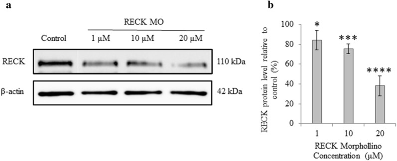 Fig. 1. Treatment of A6 cells with RECK MO resulted in decreased RECK protein levels. Immunoblot analysis was used to confirm reduction of RECK protein following treatment of A6 cells with RECK MO using Endo-porter delivery reagent. Protein was extracted from cells 48 h following treatment with increasing concentrations of RECK MO. a Knockdown of RECK protein occurred in a dose-dependent manner. β-actin is used as a loading control. b Quantification of protein levels in a were graphed and data is based on 3 biological replicates (meanâ±âSD) and normalized to control (set to 100%). Data is analyzed via t test; *, pââ¤â0.05; ***, pââ¤â0.001; ****, pââ¤â0.0001