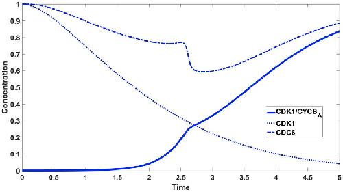 Figure 6. Concentration of CDK1, CDK1/CYCBA, CDC6 in the absence of CDC6.