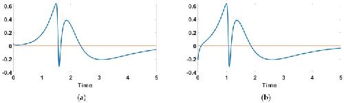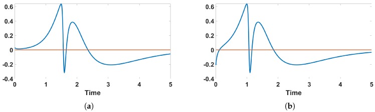Figure 8. Graphs presenting second derivatives of xa showing the number of zeros, which indicates the number of inflection points. (a) corresponds to the case with the second derivative starting from a positive value and having three zeros. (b) corresponds to the case with the second derivative starting from a negative value and having four zeros.