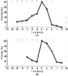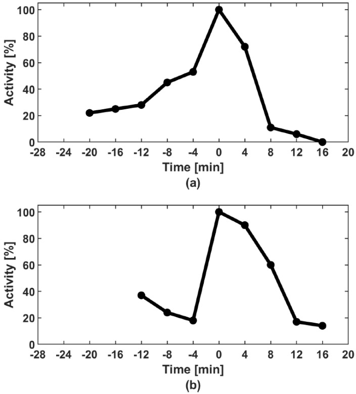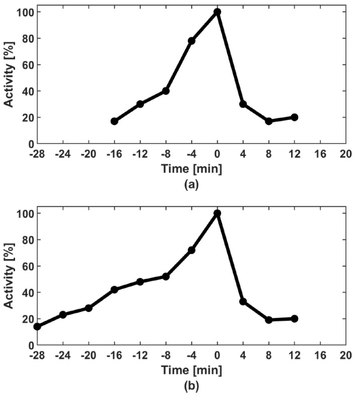 Figure 2. Differences in dynamics of CDK1/CYCBA activation curves in control extracts containing physiological amounts of CDC6. Two extreme examples are shown: Rapid activation taking 16 min (a) and slow activation taking 28 min (b). Note that the inflection points of the curves appear at different moments in relation to the maximum activity.