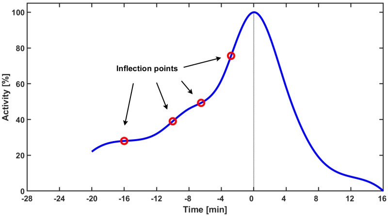 Figure 3. The smoothed curve obtained on the basis of experimental data presented in Figure 1a. Red circles indicate approximate location of inflection points for the setting with CDC6 upon M-phase entry.