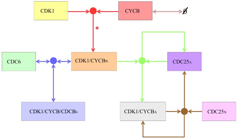 Figure 4. The schematic diagram of the considered system. Colours of arrows and dots correspond to colours of Equations (1)â(5). For simplicity we do not consider the potential marginal separation of the complex CDK1/CYCBN into CDK1 and CYCB. On the diagram we indicate this by â*â.