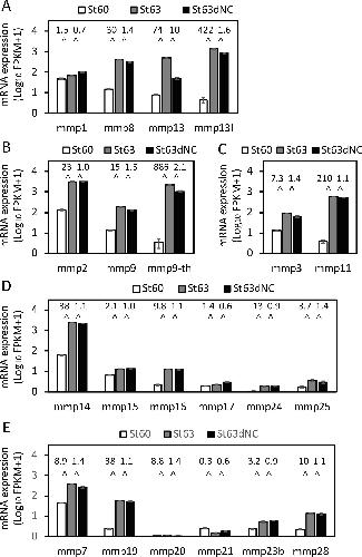 Genes referenced: mmp1 mmp11 mmp13 mmp13l mmp14 mmp15 mmp16 mmp17 mmp19 mmp2 mmp20 mmp21 mmp23b mmp24 mmp25 mmp28 mmp3 mmp7 mmp8 mmp9 not olfm4 plin1
