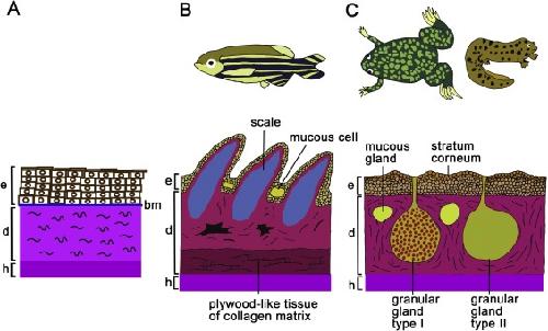 Illustrations represent the skin of an adult (metamorphosed) fish or amphibian.