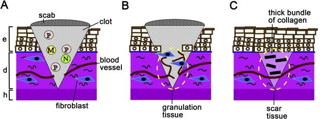 e, epidermis; d, dermis; h, hypodermal tissues; m, macrophage; n, neutrophil; p, platelet.