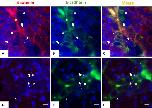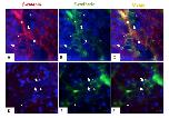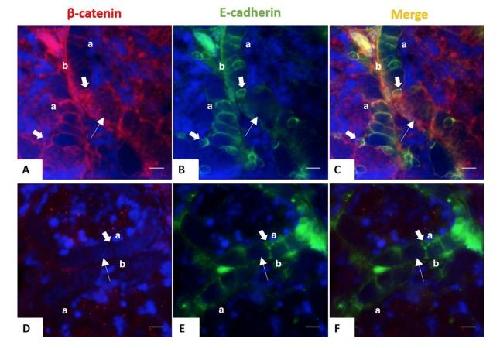 development. Double staining on testicular sections of juvenile (5-month old) (A-C) and adult (3-year old) frogs (D-F) with E-cadherin (mouse, green) and β-catenin (rabbit, red) antibodies. Nuclei were stained with DAPI (blue). Scale bar: 20 μm. Both proteins surrounded the Sertoli cells from juvenile testes, but only E-cadherin is expressed in adulthood. Thick arrows indicate Sertoli cells. Thinner arrows show germ cells. Apical â (a) and basal â (b) parts of Sertoli cells are indicated.