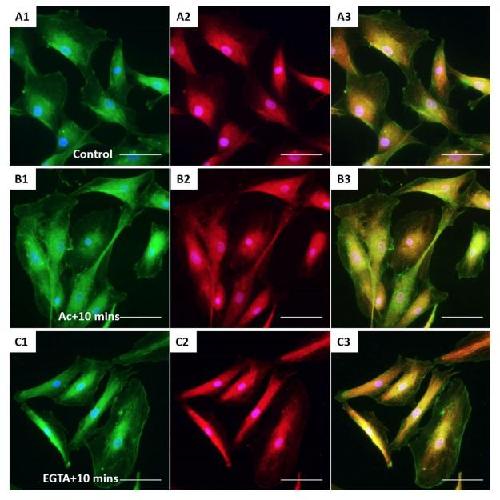 Figure 6. The effect of acrylamide and EGTA on cell adhesion proteins. Immunofluorescent images of XtiSCs 10 minutes after washing out the acrylamide (B) or EGTA (C) staining with antibodies against integrin β1 (CD29, green, A1-C1), Focal adhesion kinase (Fak, red, A2-C2), and merge (A3-C3). Nuclei were stained with DAPI (blue). Scale bar: 50 μm.