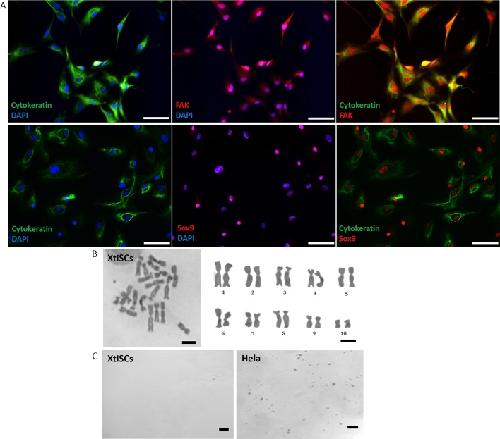Figure 3. Immunofluorescent, cytogenetic and transformation characteristics of isolated XtiSCs. (A) XtiSCs expressed Sertoli cellsâ proteins including focal adhesion kinase (FAK, red), Sox9 (red) and CK (green), a immature SC marker. Nuclei were stained with DAPI. Chromosome analysis (B) and soft agar assay (C) showed XtiSCs as non-transformed cells.