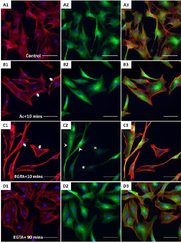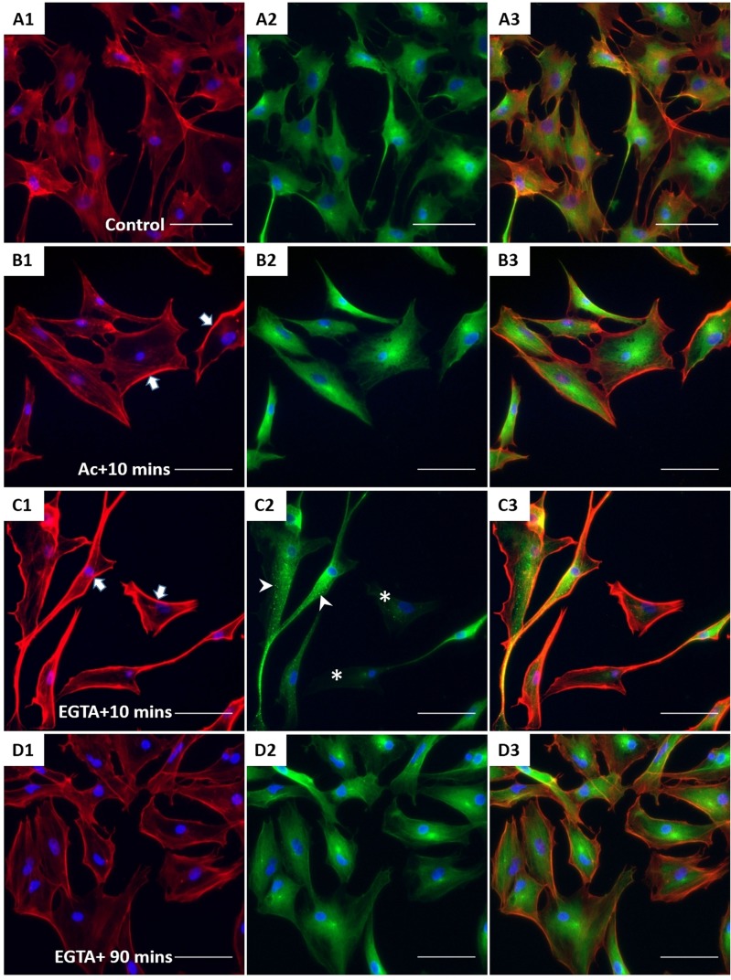 Figure 5. The effect of acrylamide and EGTA on F-actin and tubulin. After treatment, XtiSCs were collected at indicated time points for immunofluorescent staining with antibodies against F-actin (red, A1-D1), β-tubulin (green, A2-D2), and merge (A3-D3). Arrows show thick membrane F-actin in figure B1 and C1. The aggregates of β-tubulin are marked by arrowheads and asterisks indicate the cells without β-tubulin in figure C2. Nuclei were stained with DAPI (blue). Scale bar: 50 μm.