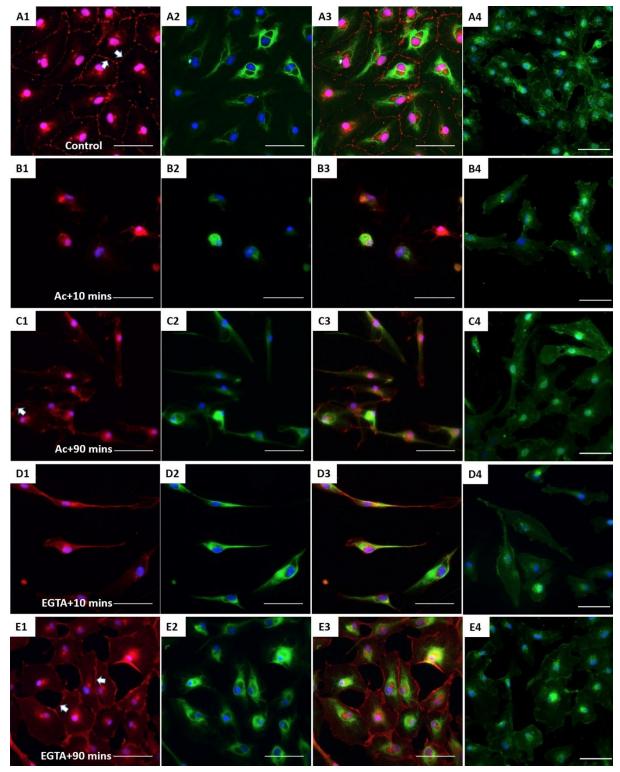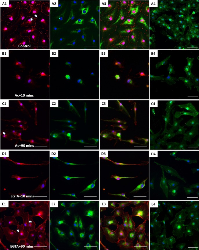 Fig. 4. The effect of CK network on the β-catenin-based cell junctions. XtiSCs were treated with vehicles (Control, A) or 10â mM acrylamide (Ac; B,C) or 2â mM EGTA (EGTA; D,E). After treatment, cells were washed and changed to the fresh medium and then collected at the indicated time points: 10â min (Ac+10 min or EGTA+10 min, B,D) or 90â min (Ac+90 min or EGTA+90 min, C,E) for immunofluorescent staining with antibodies against β-catenin (red, A1âE1), CK (green, A2âE2) and merge (A3âE3). (A4âE4) Fluorescent images of WGA-stained cells showing the cell shape and cytoplasmic membrane. Arrows show membrane β-catenin. Nuclei were stained with DAPI (blue). Scale bars: 50â μm.