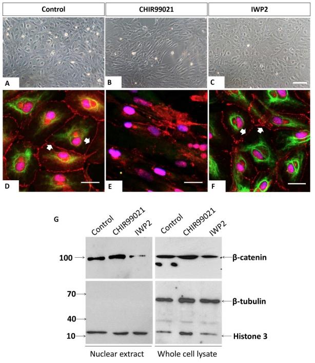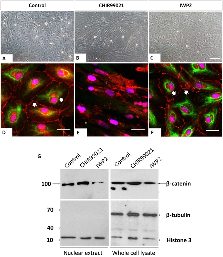 Fig. 7. CK regulates plasma membrane β-catenin. (AâC) Phase-contrast images of XtiSCs after treatment with CHIR99021 and IWP2 for 3â days show the morphological changes in CHIR99021-treated cells. XtiSCs were collected for immunofluorescence (DâF) or immunoblotting analysis (G). Immunostaining of CHIR99021-treated XtiSCs against CK (green) and β-catenin (red) reveals the disruption of the CK network and cell-to-cell contact altogether with the disappearance of membrane β-catenin. Nuclei were stained with DAPI (blue). Scale bars: 20â μm. Arrows indicate membrane-bound β-catenin. The downregulation of nuclear β-catenin in media supplemented with IWP2 was confirmed by immunoblotting (G). Histone H3 is a marker of nuclei. The absence of β-tubulin shows the purity of the nuclear lysate.