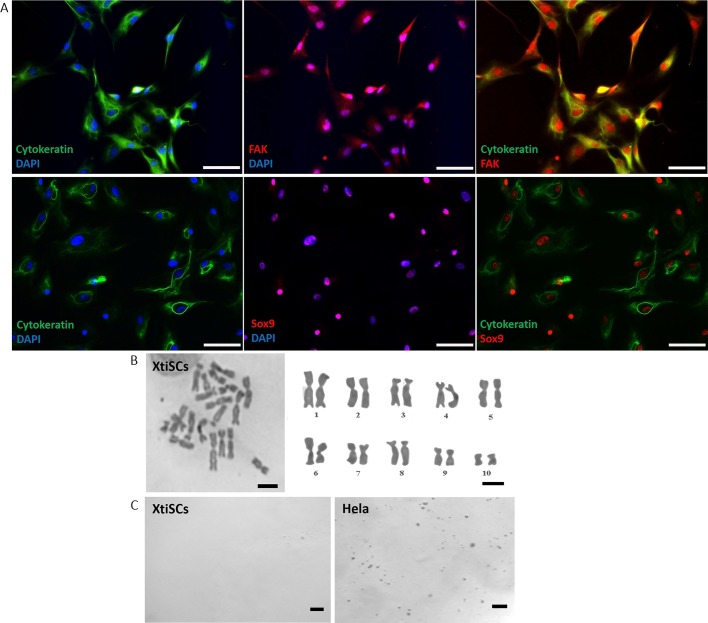 characteristics of isolated XtiSCs. (A) XtiSCs expressed SC proteins, including focal adhesion kinase (FAK, red), Sox9 (red) and CK (green), an immature SC marker. Nuclei were stained with DAPI. Chromosome analysis (B) and soft agar assay (C) showed XtiSCs as non-transformed cells. Scale bars: 50 μm (A), 10 μm (B), 400 μm (C).