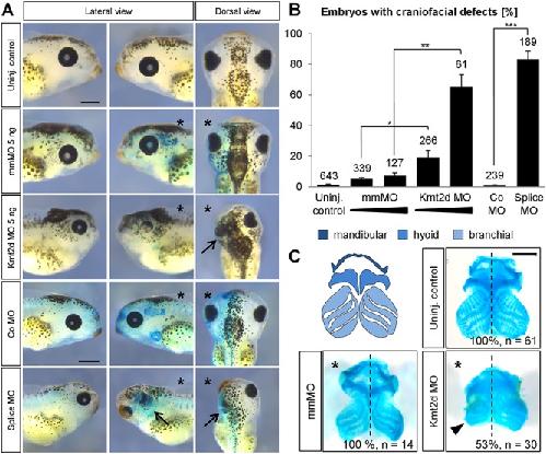 Figure 1. Kmt2d loss-of-function causes craniofacial malformations. (A) Phenotypic analysis of craniofacial defects at stage 42. Embryos were injected with 2.5â5 ng of mmMO or Kmt2d MO or 5 ng control (Co) MO or splice MO into one blastomere at the two-cell stage. 150 pg lacZ mRNA was co-injected as a lineage tracer. The injected side of the embryo is marked (asterisk). Both the Kmt2d MO and the splice MO cause severe craniofacial malformations (arrows), compared to mmMO- and Co MO-treated controls. Scale barsâ=â500 μm. (B) Graph summarizing the results from at least four independent experiments; ±SEM and the number of analyzed embryos are given for each condition. A two-tailed unpaired Studentâs t-test was applied. (C) Cartilage staining. Schematic representation of the cranial cartilage structures of a Xenopus laevis embryo (upper left panel). Embryos were injected with 2.5 ng mmMO or Kmt2d MO in combination with 50 pg mGFP mRNA as a lineage tracer into one blastomere at the two-cell stage, and the cranial cartilage was visualized by Alcian Blue staining at stage 44. Kmt2d knockdown leads to reduced cranial cartilage (arrowhead) on the injected side (asterisk). Scale barâ=â500 μm. |