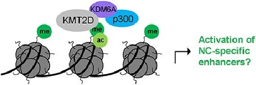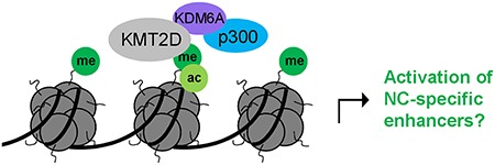 Figure 8. Working model of how KMT2D may function to activate NC-specific enhancers. KMT2D deposits H3K4me1 marks at genomic targets. p300 interaction is mediated via the KMT2D/KDM6A complex, finally leading to H3K27 acetylation and a fully active enhancer state. |