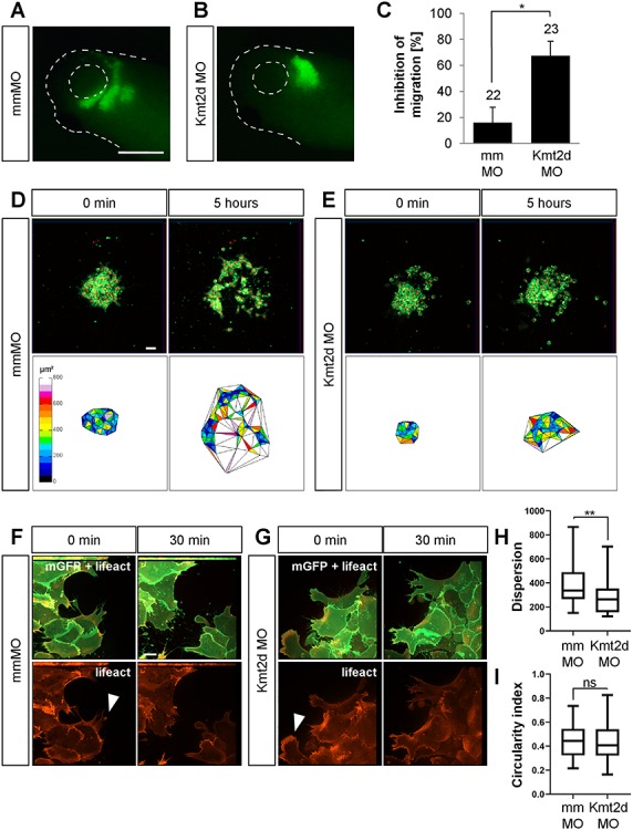 Figure 3. Kmt2d is required for cell dispersion in explanted NC cells. (A and B) Transplantation assay. Embryos were injected with 2.5 ng mmMO or Kmt2d MO in combination with 50 pg mGFP mRNA into one blastomere at the two-cell stage. Fluorescently labeled NC cells from injected embryos were transplanted into a wild-type host embryo, and their migration behavior was analyzed at stage 27. Scale barâ=â500 μm. (A) While transplanted mismatch control NC cells migrate normally, (B) the migration of Kmt2d-depleted NC cells was inhibited. (C) Graph summarizing three independent experiments with ±SEM and the number of analyzed embryos given for each condition. A two-tailed unpaired Studentâs t-test was applied. (DâG) Explant assay. (D and E) Embryos were injected with 2.5 ng mmMO or Kmt2d MO in combination with 50 pg mGFP and 250 pg H2B-mCherry mRNA to label the cell membrane and the nucleus, respectively. NC cells were explanted, cultured on fibronectin, and their migration behavior was imaged for 8 h. Cell dispersion was assessed using ImageJ. Scale barâ=â50 μm. (D) mmMO NC explants show normal cell dispersion after 5 h of cultivation, while (E) Kmt2d MO-treated cells display inhibited dispersion. (F and G) Embryos were injected with 2.5 ng mmMO or Kmt2d MO in combination with 50 pg mGFP and 300 pg lifeact-RFP mRNA to label the cell membrane and f-actin, respectively. Higher magnification of explanted NC cells reveals normal protrusion formation (arrowheads) in both (F) mmMO- and (G) Kmt2d MO-treated NC cells. Scale barâ=â10 μm. (H) Dispersion of mmMO- and Kmt2d MO-injected NC explants defined as the mean triangle size per explant (μm2) calculated by Delaunay triangulation after 5 h of cultivation in three independent experiments. Box plots show median and 25th to 75th percentiles, and Whiskers display min to max values. Mann-Whitney U test was applied (nâ=â33 mmMO explants and nâ=â28 Kmt2d MO explants analyzed). (I) Analysis of circularity showed no difference in cell shape between mmMO- and Kmt2d MO-treated NC cells (complete circleâ=â1). Box plots show median and 25th to 75th percentiles. Whiskers display min to max values. Mann-Whitney U test was applied (nâ=â53 cells analyzed from 16 mmMO NC explants; nâ=â105 cells analyzed from 27 Kmt2d MO NC explants; data from three independent experiments). |