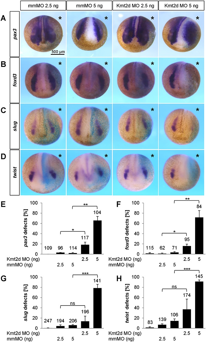 Figure 4. Kmt2d knockdown affects NPB formation and NC specification in a dose-dependent manner. (AâD) Embryos were injected with 2.5 or 5 ng mmMO or Kmt2d MO into one blastomere at the two-cell stage. 100 pg lacZ mRNA were used for lineage tracing. At neurula stages, the expression of several NC marker genes was analyzed by whole mount in situ hybridization. Injection of 5 ng Kmt2d MO leads to (A) a broader pax3 expression in the NPB region and (B) a severe reduction of foxd3, (C) slug/snai2 and (D) twist expression in the pre-migratory NC. (EâH) Graphs summarizing the results from three independent experiments for each NC marker gene analyzed in (AâD). Kmt2d loss-of-function affects the expression of (E) pax3, (F) foxd3, (G) slug/snai2 and (H) twist in a dose-dependent manner; ±SEM and the number of analyzed embryos are indicated for each condition. A two-tailed unpaired Studentâs t-test was applied. |