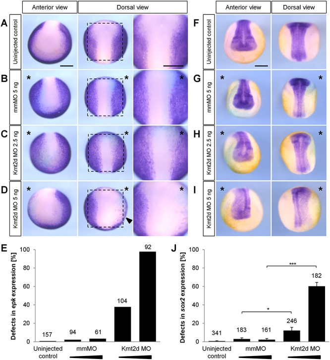 Figure 5. Kmt2d loss-of-function leads to an expansion of the neural plate as indicated by altered epidermal keratin and sox2 expression. Two-cell stage embryos were injected with 2.5 or 5 ng of mismatch (mm) MO or Kmt2d MO in combination with 100 pg lacZ mRNA as a lineage tracer. The injected side of the embryo is marked (asterisk). Scale barsâ=â500 μm. (AâD) In situ hybridization for the non-neural ectoderm marker epidermal keratin (epk) was performed at stage 14. (A) Uninjected control embryos and (B) mmMO treated controls show normal epk expression in the epidermal ectoderm. (C) While 2.5 ng Kmt2d MO has no effect in the majority of embryos, (D) 5 ng Kmt2d MO leads to a dorsolaterally reduced epk expression. (E) The graph summarizes the mean percentage of embryos with epk expression defect from two independent experiments. The total number of analyzed embryos is indicated for each condition. (FâI) In situ hybridization for the neural plate marker sox2 was performed at stage 19. (F) Uninjected control embryos and (G) mmMO treated controls show normal sox2 expression in the neural plate. (H) While 2.5 ng Kmt2d MO has no effect in the majority of embryos, (I) 5 ng Kmt2d MO leads to an expansion of the sox2-positive territory. (J) Data from four independent experiments. Graph summarizes the mean percentage of embryos with sox2 expression defect. The total number of analyzed embryos and ±SEM are indicated for each condition. A two-tailed unpaired Studentâs t-test was applied. |