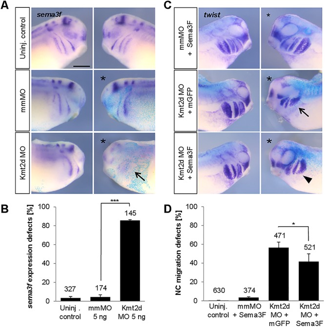 Figure 7. Kmt2d loss-of-function inhibits Sema3F expression and ectopic Sema3F can partially substitute for Kmt2d. (A) Sema3F expression is reduced in Kmt2d morphants. Embryos were co-injected with 5 ng mmMO or Kmt2d MO and lacZ mRNA as a lineage tracer. In situ hybridization for sema3f confirms that Kmt2d knockdown inhibits Sema3F expression in Xenopus embryos (arrow). (B) Graph summarizing the data from three independent experiments. Total number of analyzed embryos and ±SEM are indicated for each condition. A two-tailed unpaired Studentâs t-test was applied. (C) Two-cell stage embryos were co-injected with 2.5â3 ng Kmt2d MO and 250 pg sema3F mRNA or mGFP mRNA and subjected to twist in situ hybridization. Overexpression of Sema3F results in a partial rescue of NC migration in Kmt2d-depleted embryos. (D) Graph summarizing the data from six independent experiments. Total number of analyzed embryos and ±SEM are indicated for each condition. A Fisherâs exact test was applied. |