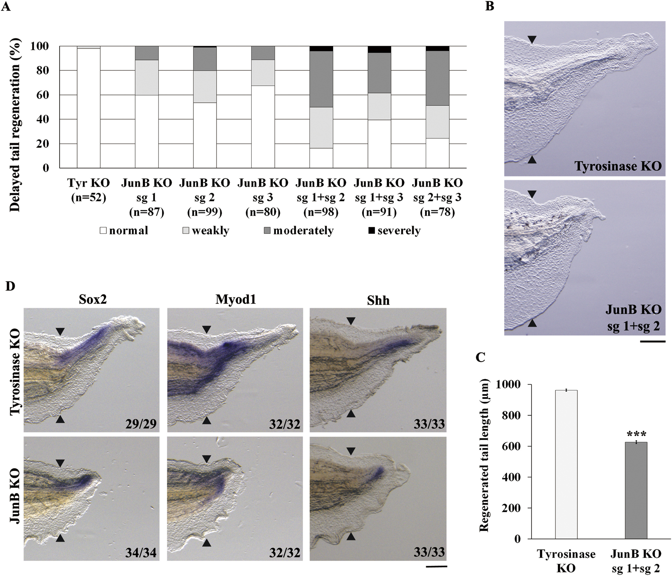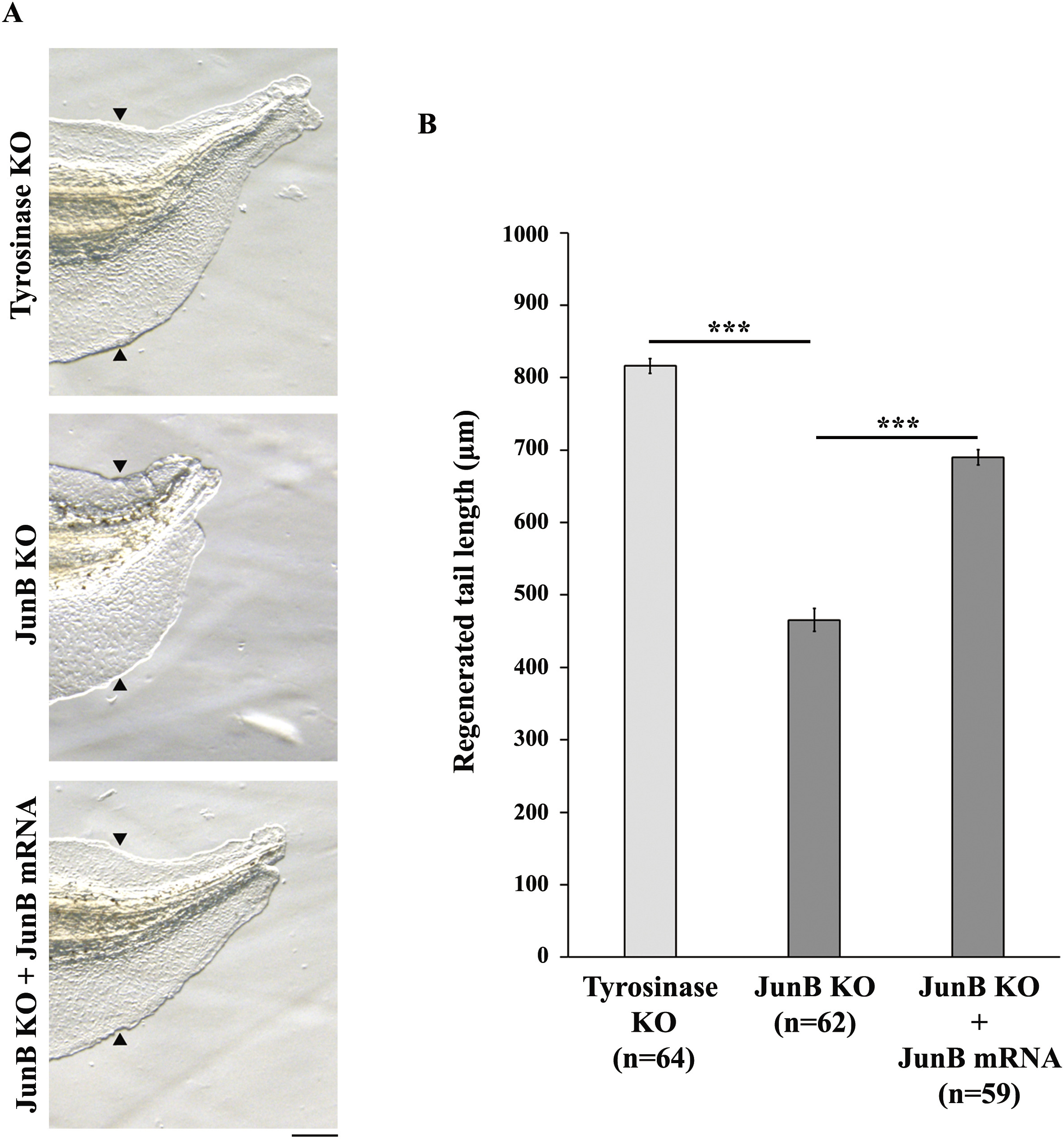 Xenopus tropicalis tadpoles can regenerate an amputated tail, including spinal cord, muscle and notochord, through cell proliferation and differentiation. However, the molecular mechanisms that regulate cell proliferation during tail regeneration are largely unknown. Here we show that JunB plays an important role in tail regeneration by regulating cell proliferation. The expression of junb is rapidly activated and sustained during tail regeneration. Knockout (KO) of junb causes a delay in tail regeneration and tissue differentiation. In junb KO tadpoles, cell proliferation is prevented before tissue differentiation. Furthermore, TGF-β signaling, which is activated just after tail amputation, regulates the induction and maintenance of junb expression. These findings demonstrate that JunB, a downstream component of TGF-β signaling, works as a positive regulator of cell proliferation during Xenopus tail regeneration.