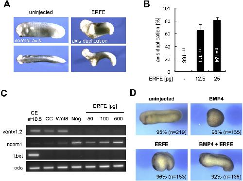 Fig. 1. ERFE induces axis duplication and antagonizes BMP signaling activity in Xenopus embryos and ectodermal explants. A-B. ERFE overexpression causes secondary axis formation. Four-cell stage embryos were injected with different amounts of erfe mRNA marginally into one ventral blastomere, in three independent experiments. A. Representative embryos showing normal axis development in the left or secondary axis formation upon ERFE overexpression in the right panel. The upper panel shows embryos from a lateral view, the lower panel from a dorsal view. B. Quantification of axis duplication phenotypes observed in ERFE overexpressing embryos. Amounts of injected RNA, number of injected embryos, and s.e.m. are indicated. C. ERFE inhibits expression of the BMP target gene ventx1.2 and activates the neural marker ncam1 in animal cap explants. Two-cell stage embryos were injected with 30 âpg wnt8a, 300 âpg noggin, and 50 âpg, 100 âpg or 500 âpg erfe mRNA animally into both blastomeres. Ectodermal explants were isolated at stage 8/9 and grown to the equivalent of stage 10.5. RNA was analyzed by RT-PCR. CE â uninjected control embyro; CC - naïve control caps. D. BMP4-induced ventralization is rescued by ERFE co-expression. 1 âng bmp4 and/or 100 âpg erfe mRNA were injected marginally into two dorsal blastomeres at the four-cell stage. The penetrance of the phenotype (% of all embryos) and numbers of embryos analyzed (n) are indicated. |